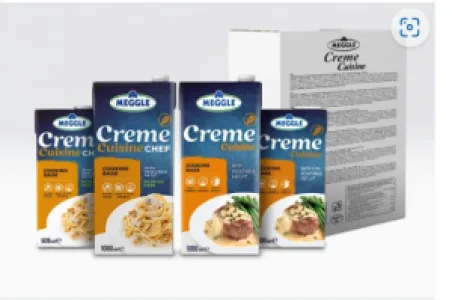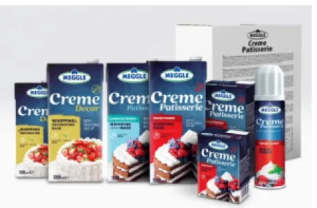 Creme Dual Unsweetened, for cooking and whipping applications (1liter and 200 ml, 25% vegetable fat), Creme Patisserie, sweetened and unsweetened, Creme Cuisine and Creme Cuisine chef for cooking applications (1liter and 500 ml, 15% vegetable fat) for whipping applications, Creme "Mascarpone" (250 g), Creme Patisserie spray (250 g)