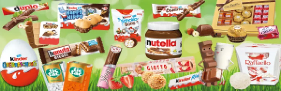 Ferrero products: Nutella, Bueno, kinder happy Hippo, kinder Duo, Hanuta, kinder Riegel, Kinder country, duplo chocnut, kinder cards, kinder joy, Überraschungs-Ei, tic tac X-fresh, Milch-Schnitte, Ferrero Eis, Raffaelo, Rocher