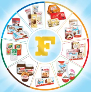 Ferrero: Nutella, B-Ready, Tic Tac, Hanuta, Happy Hippo, Bueno, Duo, Kinder Cards, Kinder Joy, Rocher, Raffaelo, Giotto, Mon Chéri, Ice Creme.
