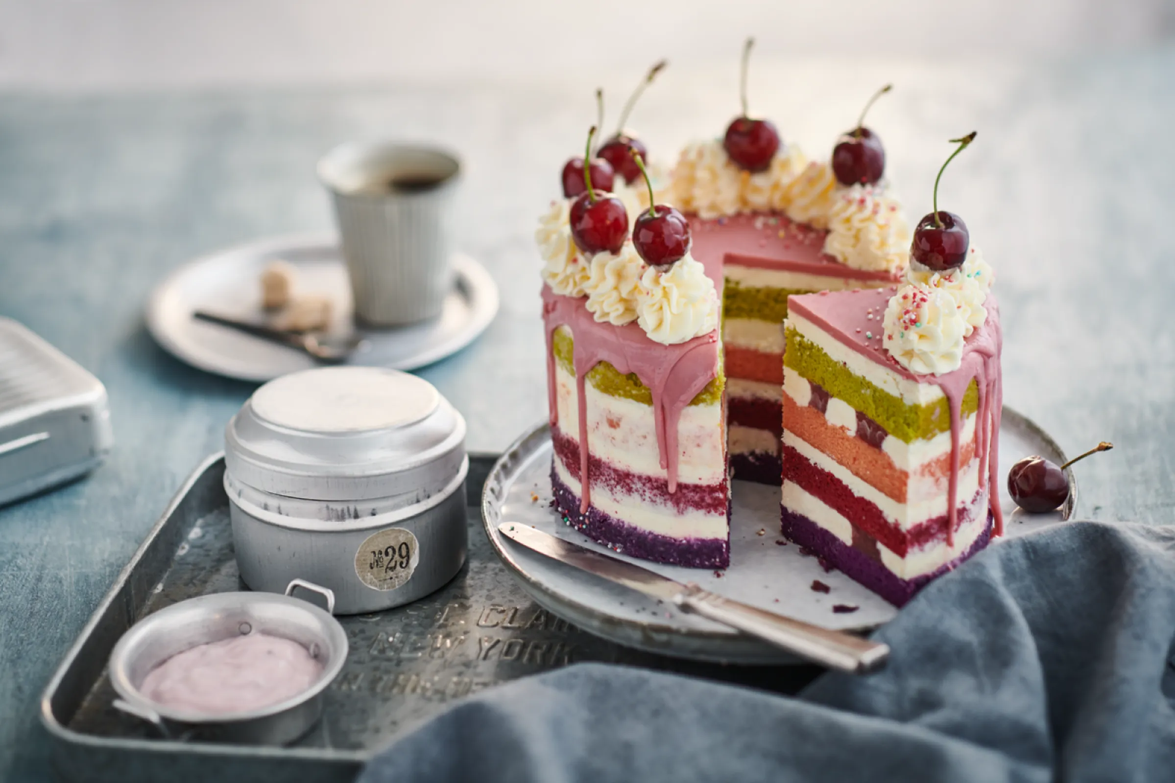 Powdered baking agent for fine baked goods for making colored cake mixes.